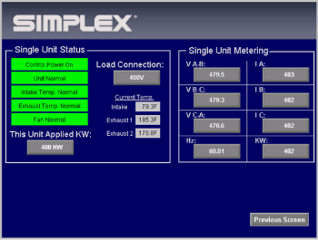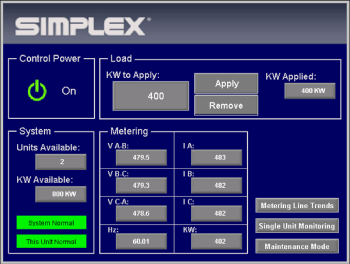 The Simplex dynaMITE is a large capacity, high performance Portable Load Bank designed to provide the manufacturers, distributors and users of large AC generators and UPS systems with sophisticated testing capability. dynaMITE Load Banks feature digital controllers with network control and data acquisition capability. Operator interface is via touchscreen. Load control is via screen keypad. All electrical values display on the screen and are recorded by the system for future data retrieval. Any number of dynaMITE and Electra Load Banks can be combined for large system capacities and networked for central control and data acquisition.